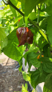 A beautiful take on the classic Trinidad Scorpion pepper. This stunning cocoa-colored chili pepper may be about 100 times hotter than the jalapeno. We recommend wearing gloves when harvesting and to be cautious eating it raw. The short, stubby, 2 inch long, wrinkled, chocolatey-brown-red peppers are borne on productive plants. The peppers have a more mellow, less acidic flavor with smoky undertones and hints of a nice earthy sweetness -- perfect for hot, hot sauces!